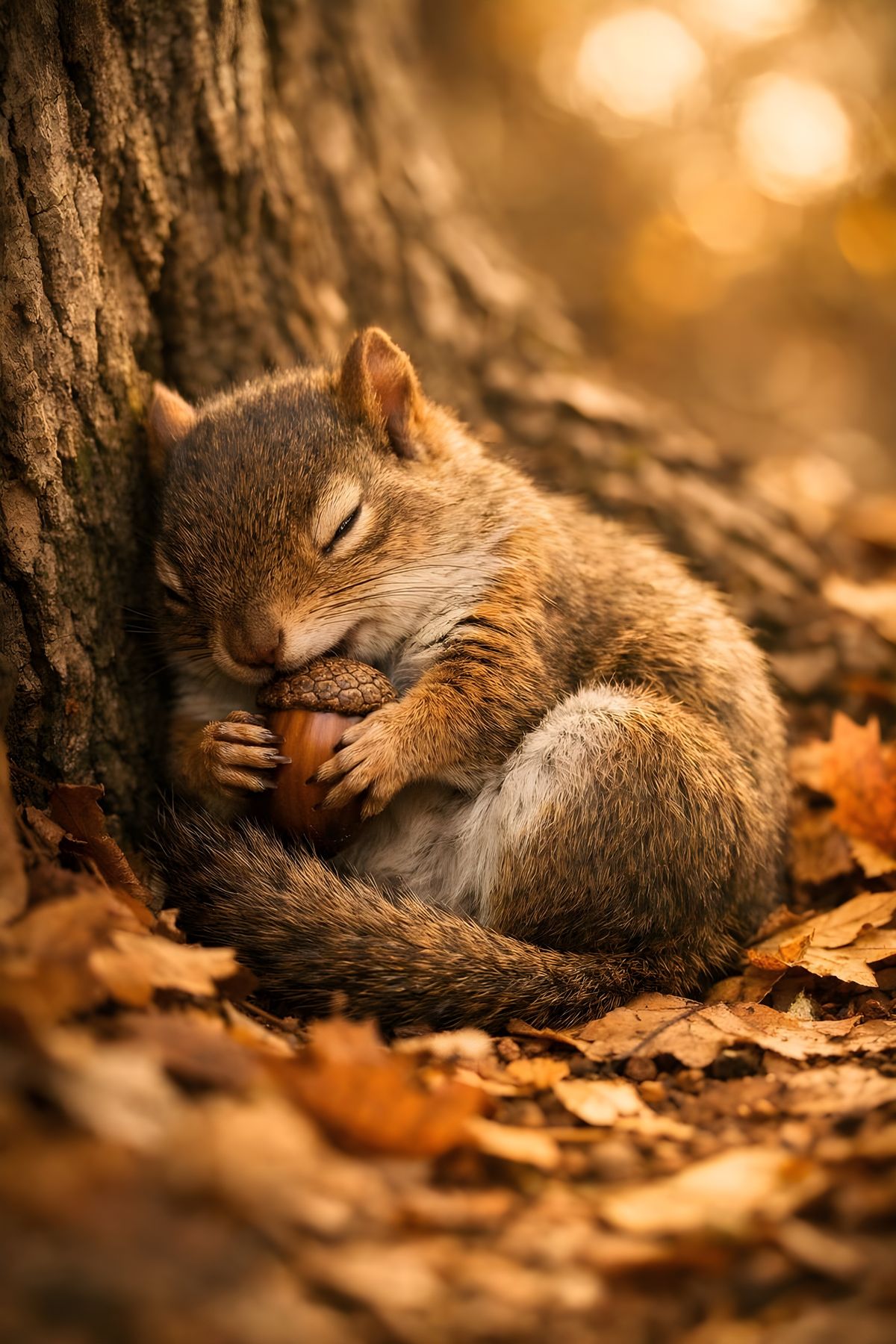 This ultra-realistic image shows a squirrel resting contentedly with an acorn at the base of a tree, bathed in warm, cinematic autumn light. It captures a moment of quiet satisfaction and relief.