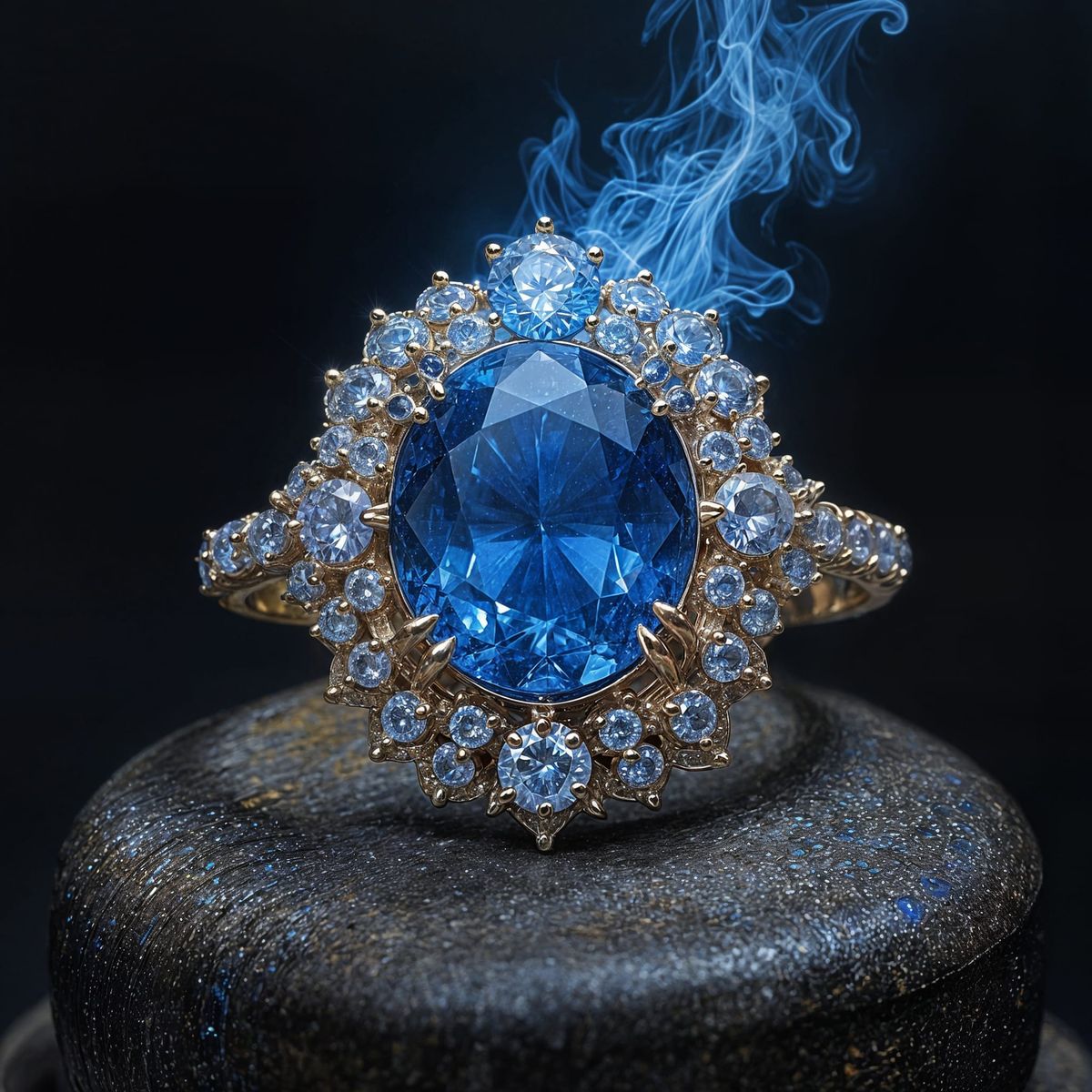 A striking picture of a flaming blue sapphire set in a gold and silver ring. The jewelry is displayed against a dark background with classical painting elements.