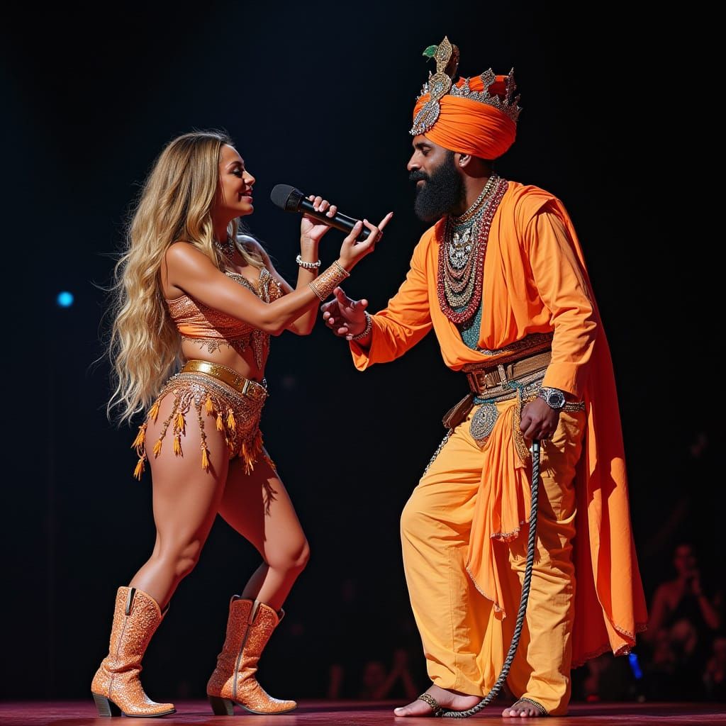 A striking image of Beyonce in a luxurious cowgirl costume, singing in unison with a traditionally dressed Hindu man, both standing on a grand stage in a highly detailed, photorealistic style, reminiscent of fine art portraiture.