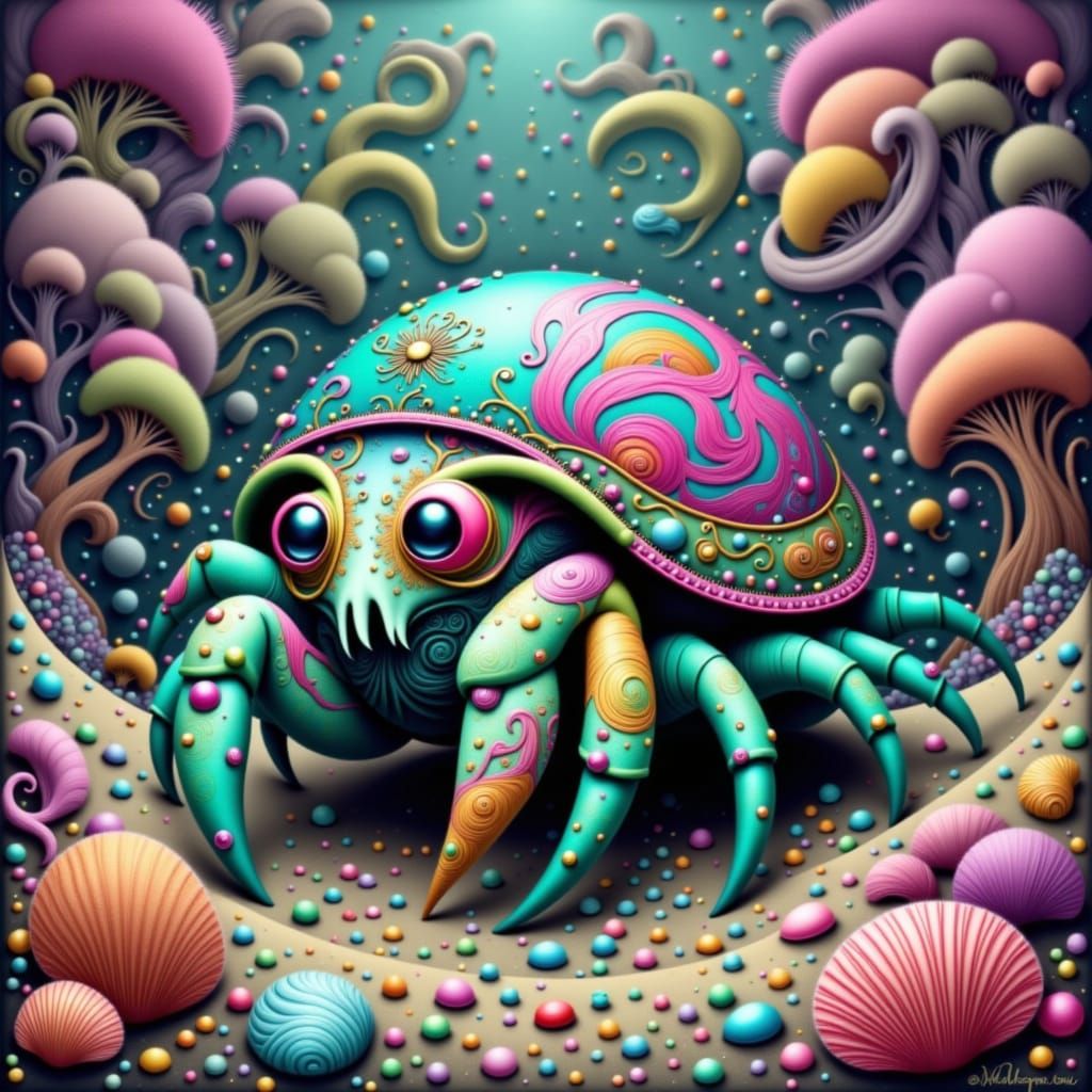 Design your own unique hermit crab creations using vibrant, psychedelic patterns and styles. Free and easy AI image generation.