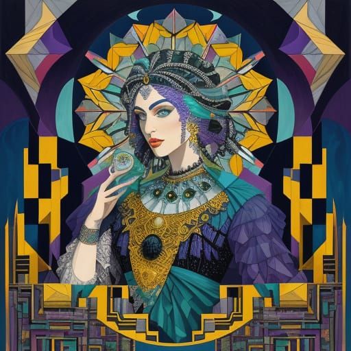 This image showcases a stylized, art deco-inspired depiction of Ferdinand Knab amidst geometric shapes and patterns, echoing the themes of Mozart's Magic Flute. Featuring high contrast, vibrant colors and intricate details, this piece blends elements of cubism and fauvism.