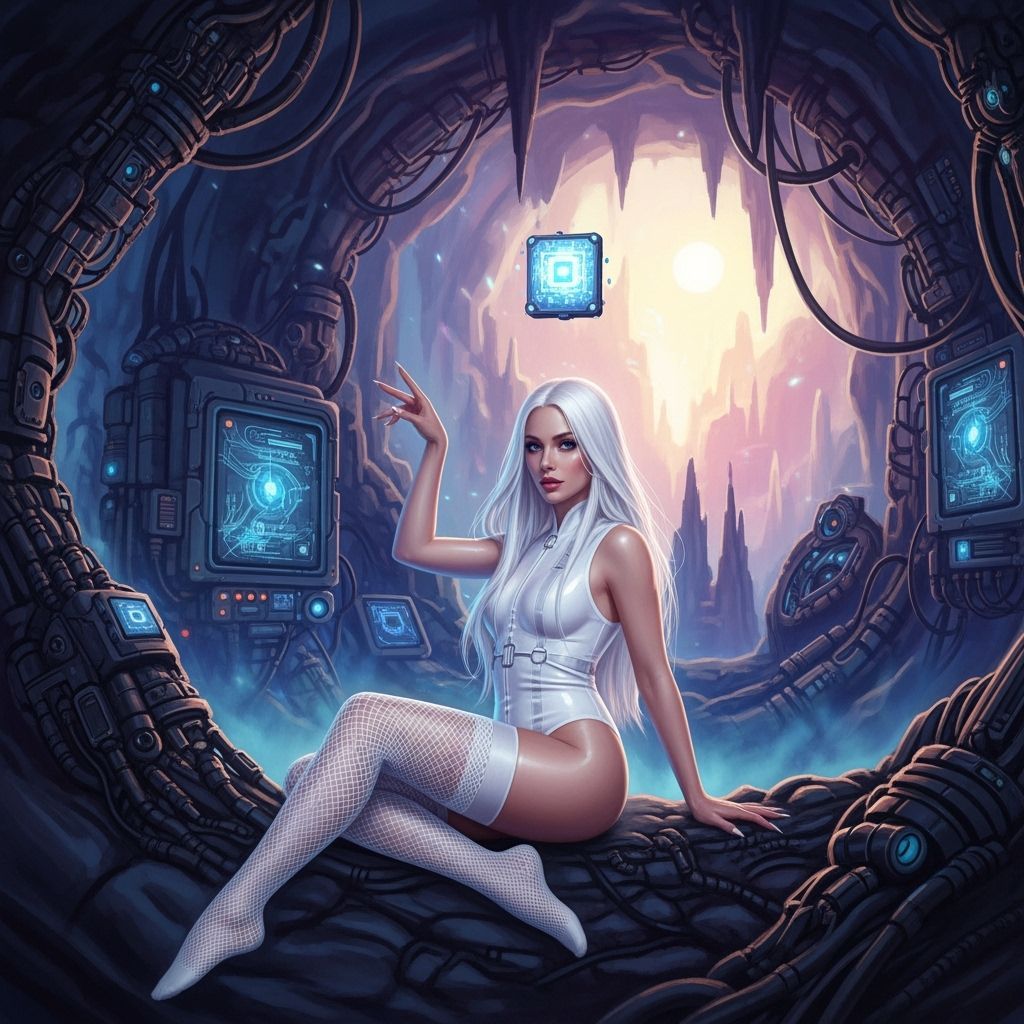 A slender woman with long white hair sits in a cave filled with mechanical components. The image showcases a futuristic style, reminiscent of biomechanical designs and vibrant concept art.