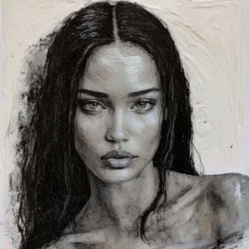 A striking portrait of an elegant gothgirl with a short bob and big eyes, rendered in a high-contrast, minimalist impasto style with influences of organic line drawing.