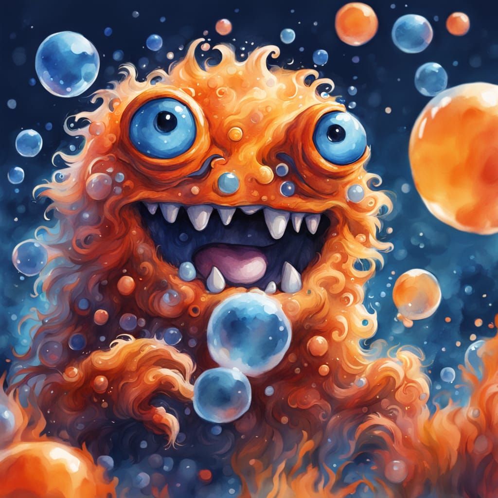 A whimsical watercolor illustration of a fluffy orange monster blowing bubbles. The artwork features soft brushstrokes, warm sunny lighting, and complementary blue and orange colors in a fantasy style.