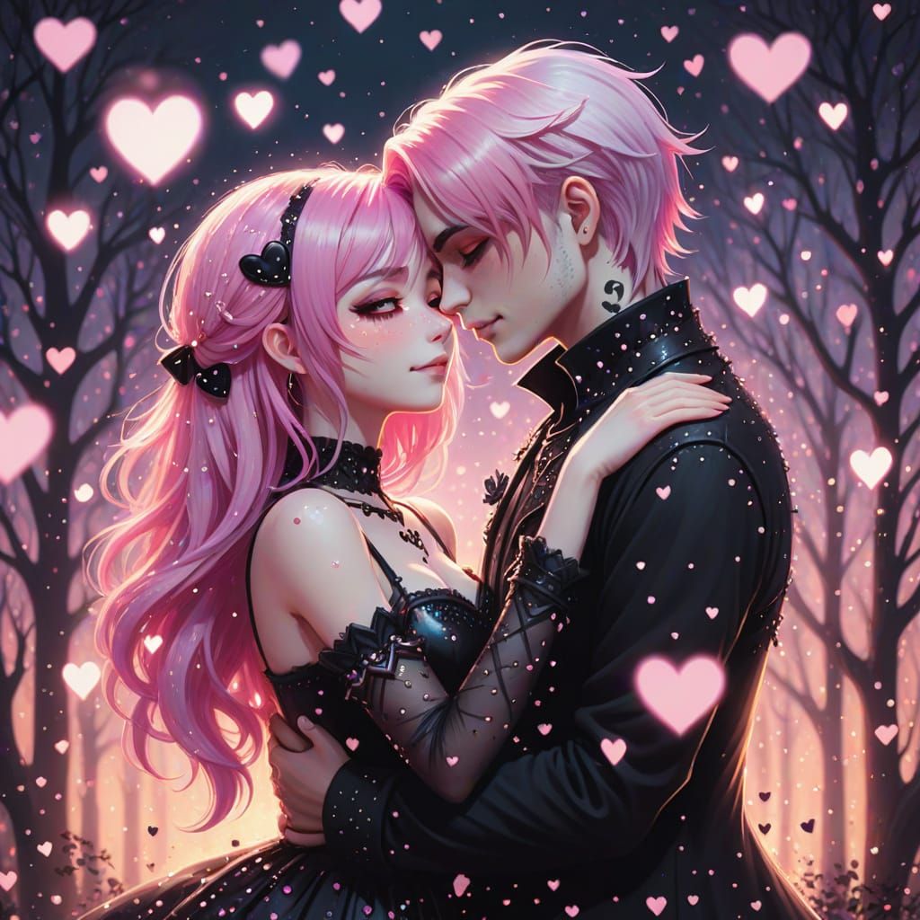 This image shows a goth anime couple embracing amidst floating hearts and sparkles. The close-up digital painting in anime style features warm lighting and a soft pastel background for a romantic, ethereal aesthetic.