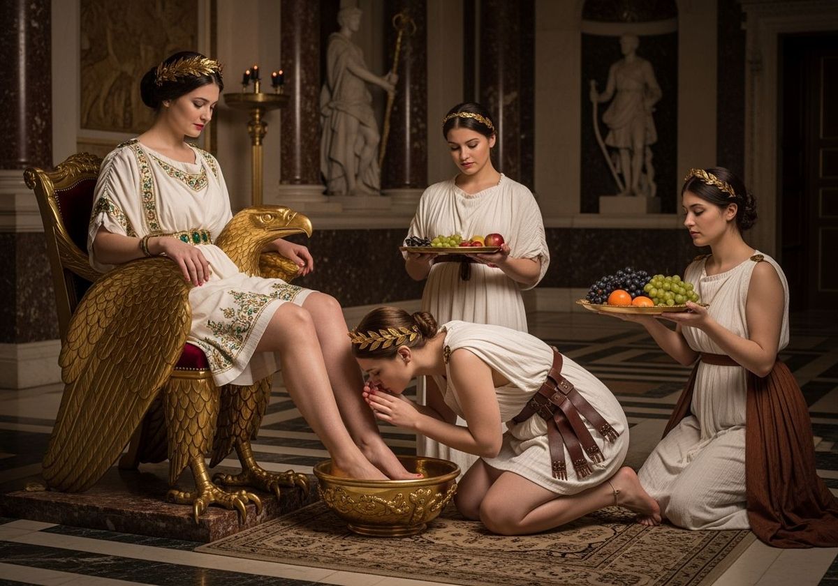 A DSLR photograph of a Roman Empress on an eagle-shaped throne, attended by servants in a luxurious palace. This image evokes the style of classic baroque painting with sharp focus and natural light.