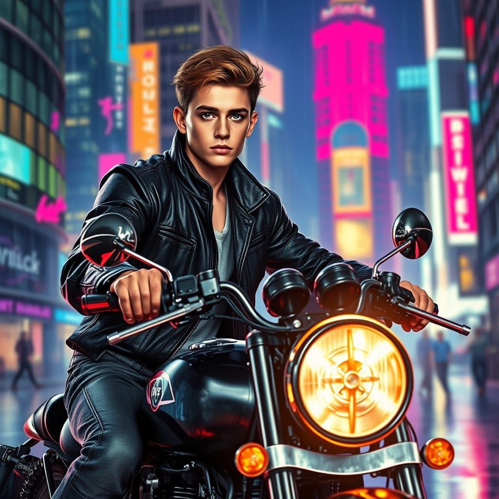 This image shows a young man with violet eyes riding a sleek, futuristic motorcycle through a neon-lit cyberpunk city, blending gritty realism with fantasy elements in a cinematic and epic atmosphere, inspired by industrial futurism and neon noir aesthetics.