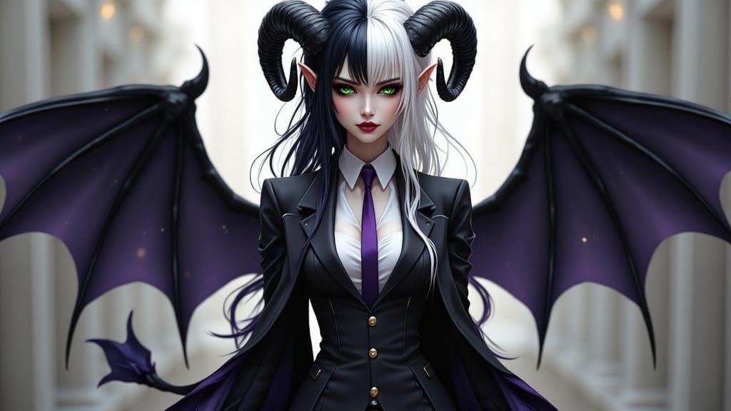 This image shows a stunning anime woman with intricate details, a black suit, and striking features, set against a dramatic backdrop with precise textures and subtle shading in a hyper-realistic style.