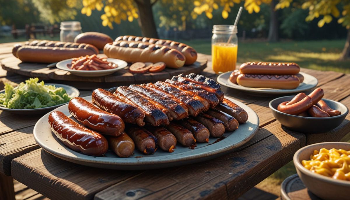 This image shows a barbecue feast laid out on a rustic picnic table. The scene is bathed in warm sunlight, highlighting the glossy sausages and golden buns in a hyper-realistic, airbrushed painting style.