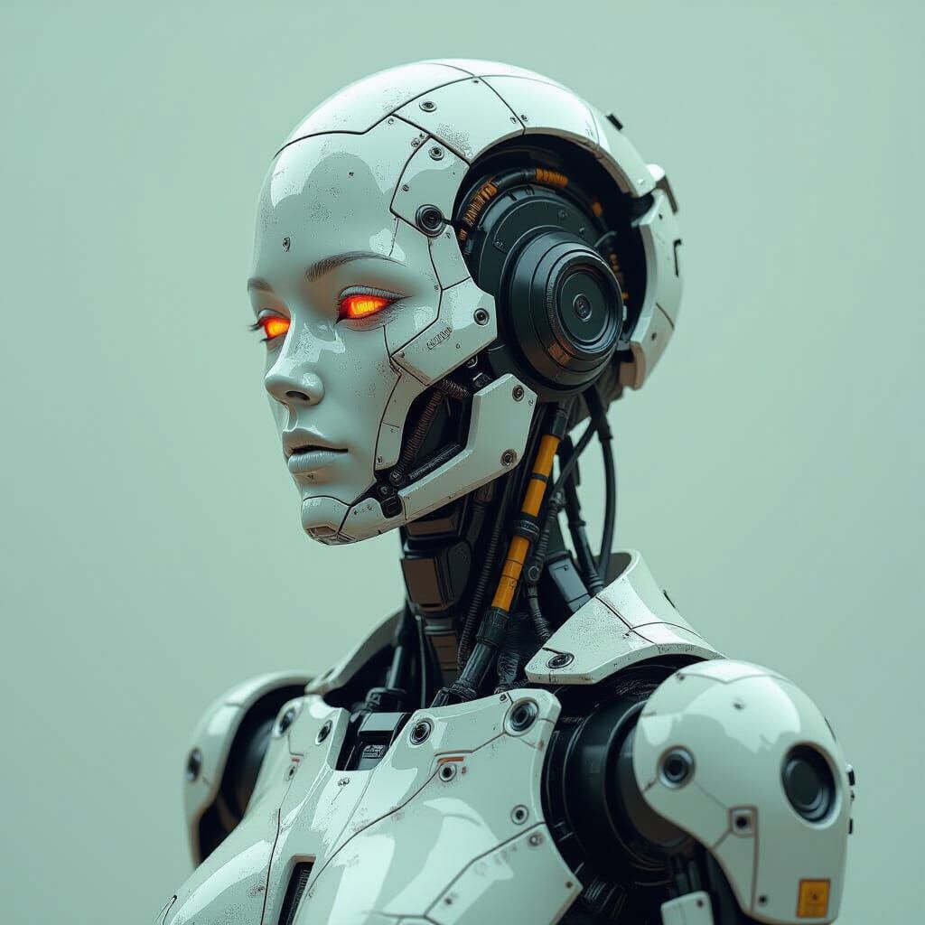 This image shows a broken android at the end of its life. The art style is a blend of industrial decay, biomechanical art, and machine ruin with a muted color palette.