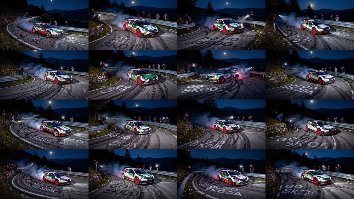 This ultra-realistic image captures a Skoda Fabia rally car executing a dramatic drift through a steep downhill hairpin turn at night. Visible details include glowing brakes, tire smoke, and spectator flashes.