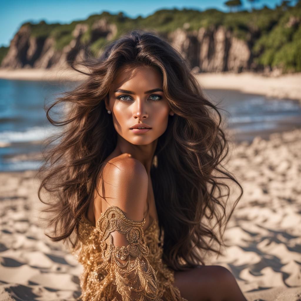 This image showcases a nude Brazilian woman with long brown hair and blue eyes on a beach. The picture highlights her décolletage and opulent chest.