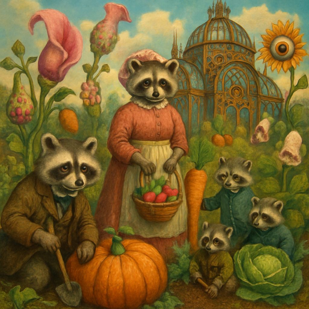 This image shows a surreal garden scene featuring raccoons in vintage attire tending to oversized vegetables and genetically modified flowers. A steampunk greenhouse stands in the background, rendered in a painterly style.