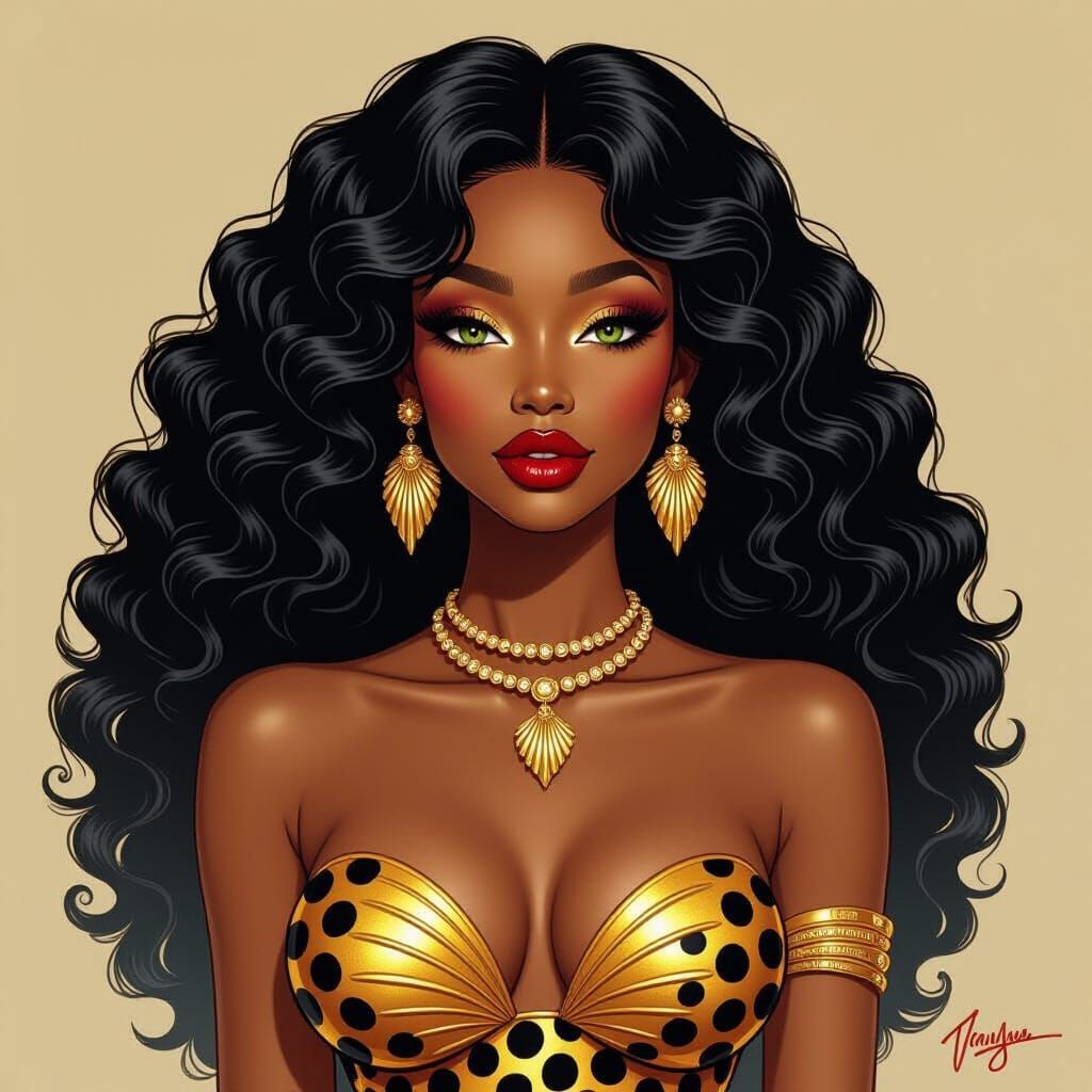 A striking picture of an African mermaid with 70s-style hair, red lips, and golden eyes. She wears a gold seashell top and cheetah-print tail, accessorized with gold jewelry in a Basquiat-meets-Okubo style.