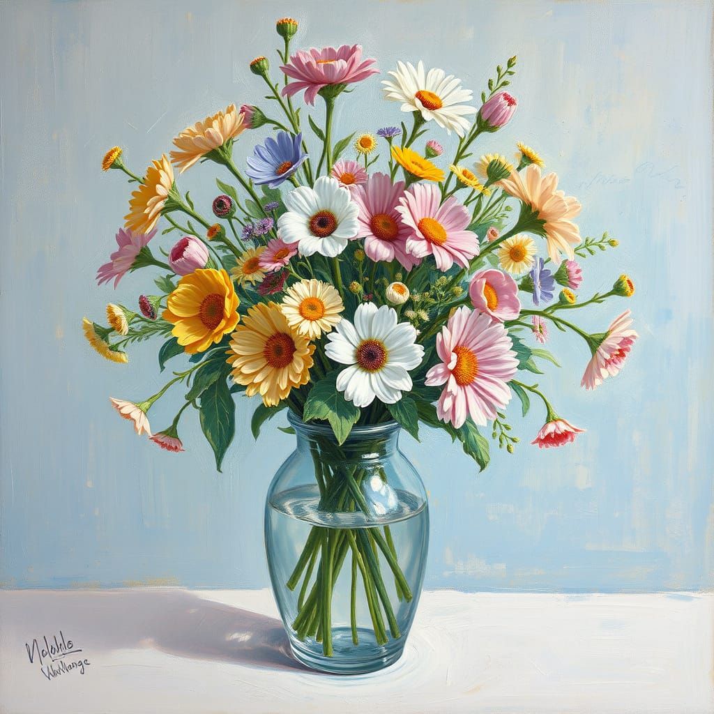 A vibrant image of wildflowers arranged in a vase. The artwork is rendered with thick brushstrokes and a pastel color palette, reminiscent of post-impressionist painting.