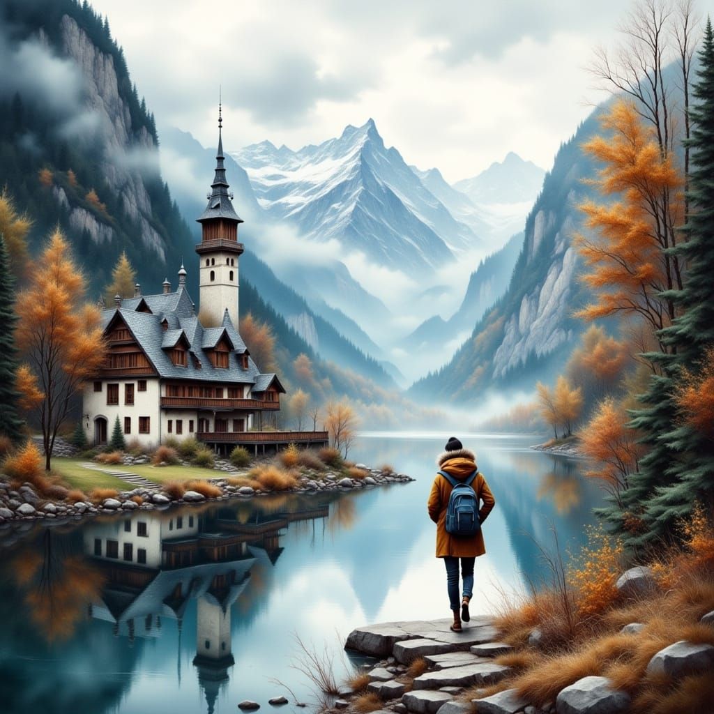 This image shows a lone traveler in Hallstatt, Austria, walking beside a tranquil lake. Rugged mountains and quaint chalets surround them, rendered in muted colors with soft brushstrokes as a matte painting.
