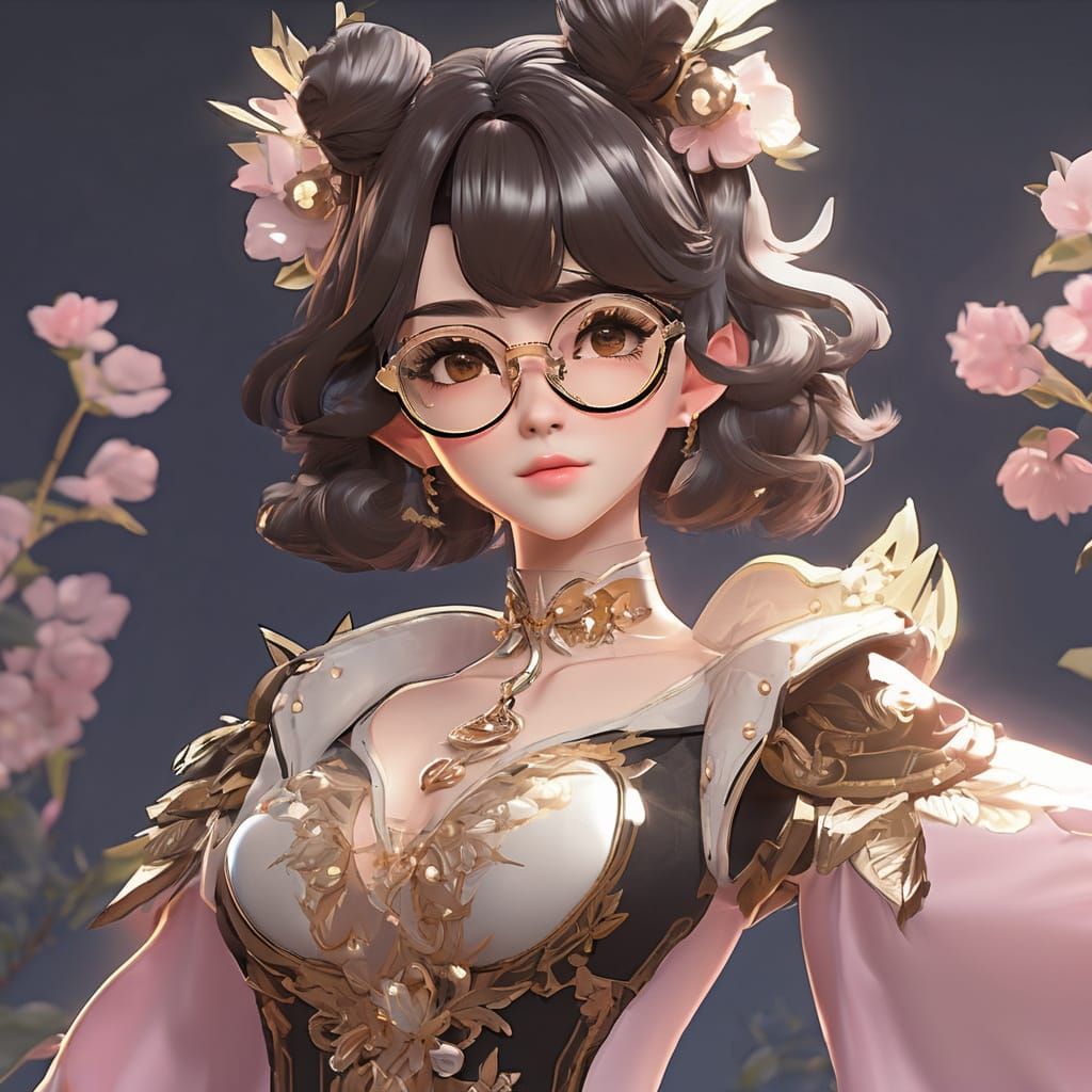 This image shows a close-up 3D anime portrait of a female dwarf with dark hair and glasses, wearing feminine clothing. The artwork features a soft pastel color palette and warm lighting.
