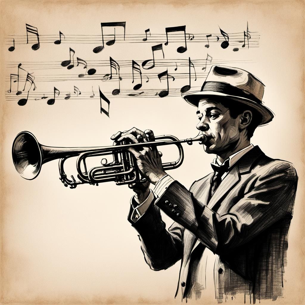 A vintage charcoal sketch of a musician playing the trumpet in a beige room. The artwork uses loose brushstrokes and hatching to create a nostalgic, high-contrast image.