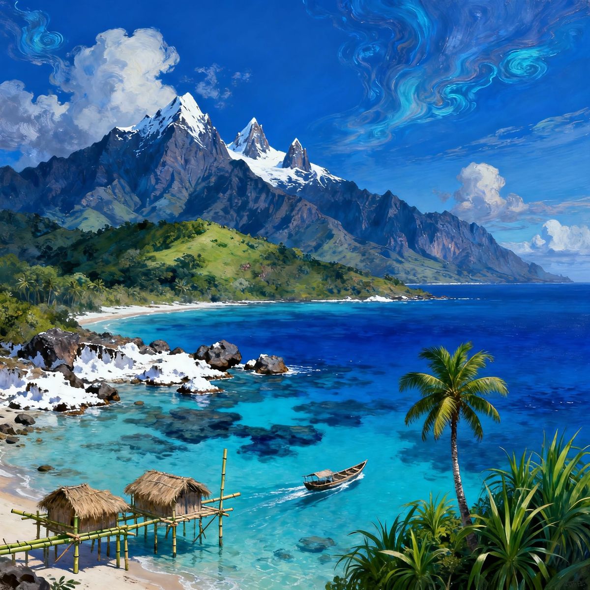 This image depicts a rugged, remote island landscape with snow-capped mountains, lush vegetation, and a deep blue sea. A lone palm tree and traditional huts add to the secluded atmosphere under a surreal sky.