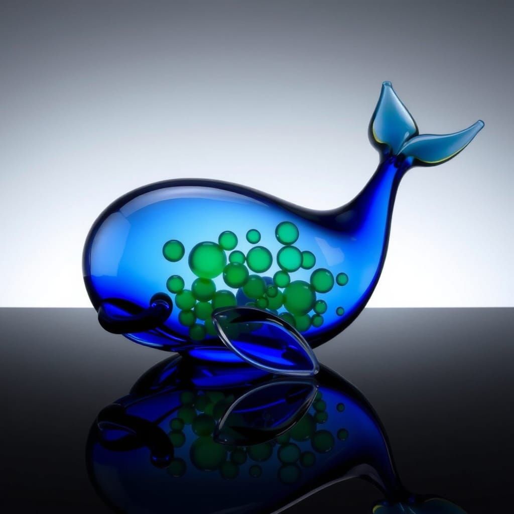 A stunning image of an ornate whale sculpture made from delicate blue glass. Tiny green bubbles are suspended within the glass, creating subtle light reflections in a Chihuly-inspired style.