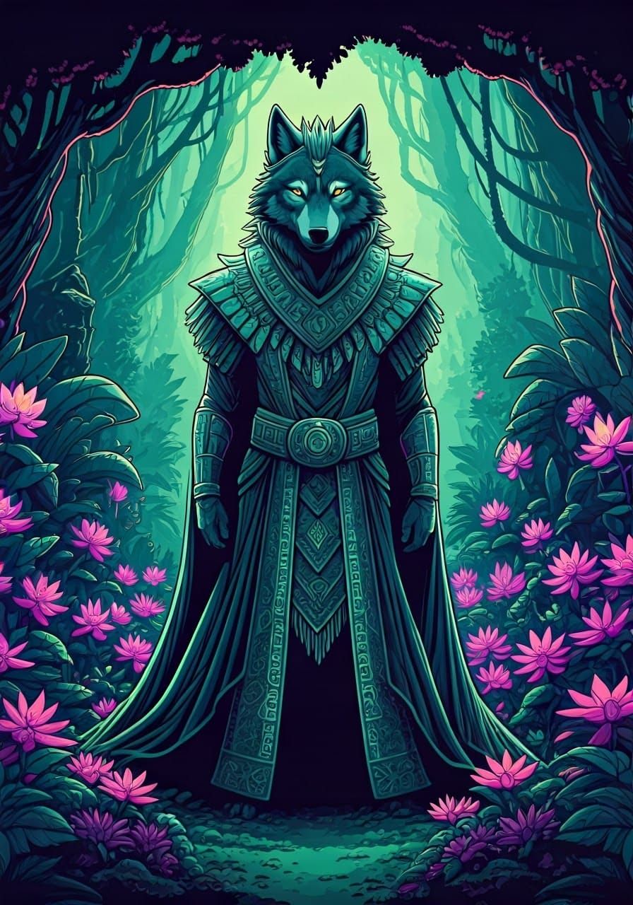This image features a humanoid wolf character standing in a mystical, vibrant fantasy forest, surrounded by teal trees, purple flowers, and intricate, glowing tribal jewelry. The scene is reminiscent of fantasy comic book art, with strong, angular lines and elaborate details.