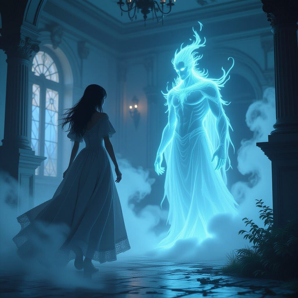 A spectral figure confronts a woman entering a decaying manor, revealing he knows her name. Rendered in a dynamic 3D anime art style with intricate details and hyperrealistic lighting.