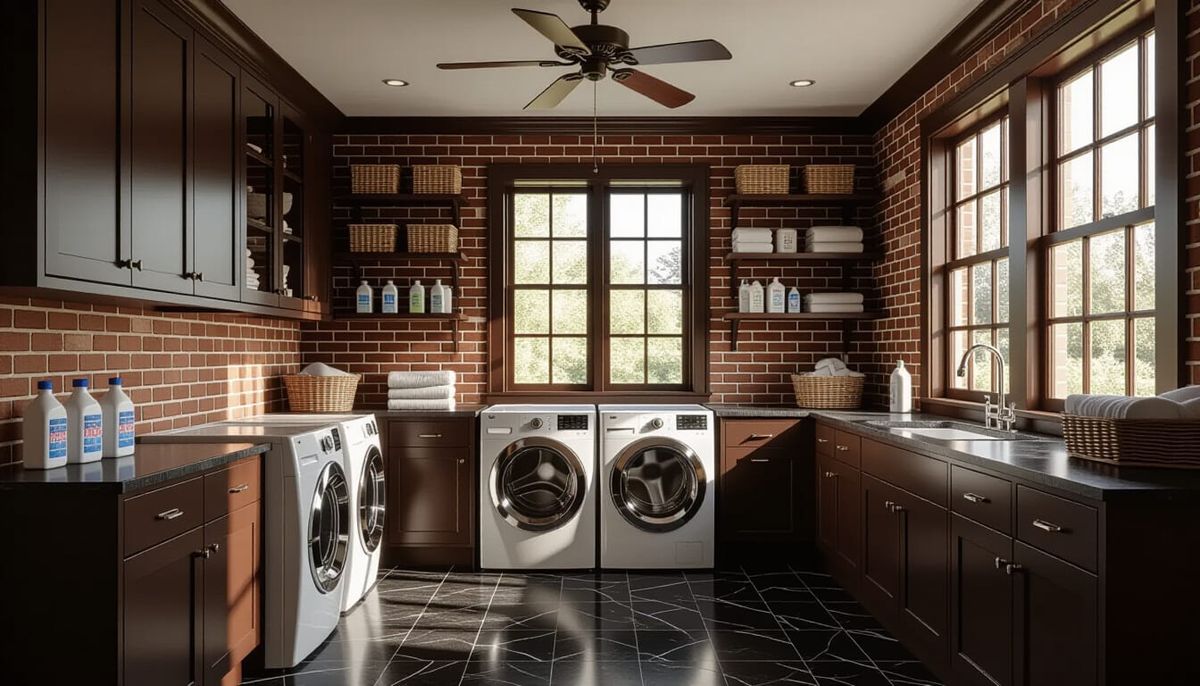This AI-generated image showcases a wide-angle view of a Victorian laundry room, featuring dark cabinets, brick wallpaper, and a glass wall. Soft light illuminates the space, highlighting the marble floor and appliances.