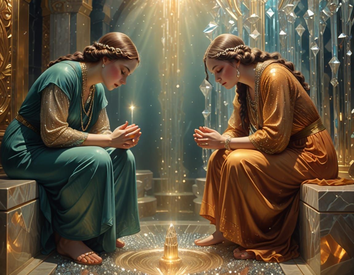 A serene portrait of a woman praying to a sparkling crystal fountain, surrounded by pastel colors and a soft, golden glow, in the style of Art Deco digital art.