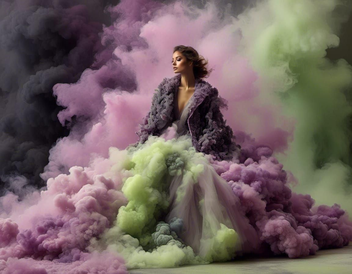 A striking picture of a designer coat seemingly made from colored smoke. The coat rests on a plush surface inside a glamorous room. The artwork features light lime and Geraldine color gradients.