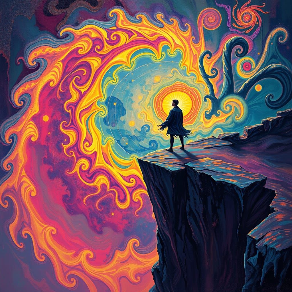 This image shows a dramatic, vibrant landscape with shimmering neon colors, bold brush strokes, and gradient lighting, capturing a sense of hope and despair.