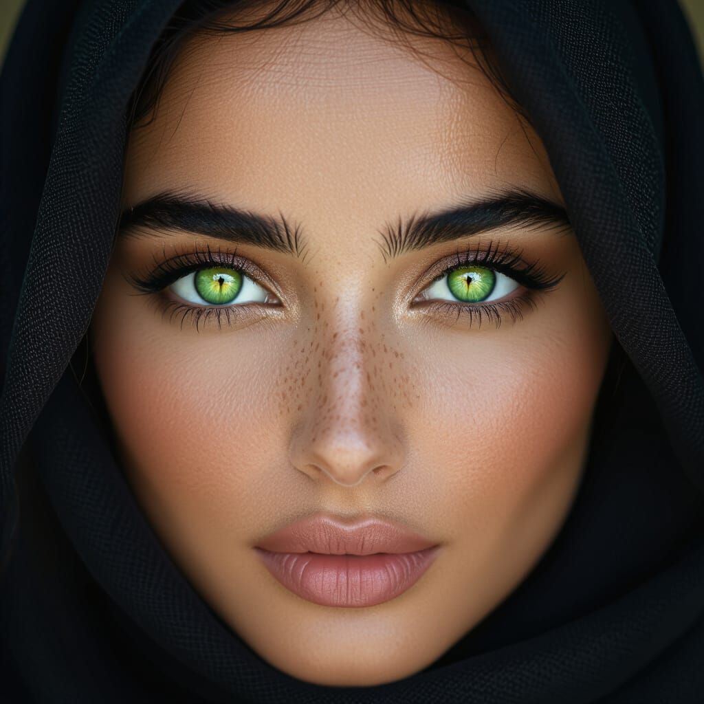 A close-up image of a beautiful Arabian woman's face. One half displays flawless olive skin, while the other is fragmented like glass, shimmering with silver, blue and violet in a hyperrealistic style.