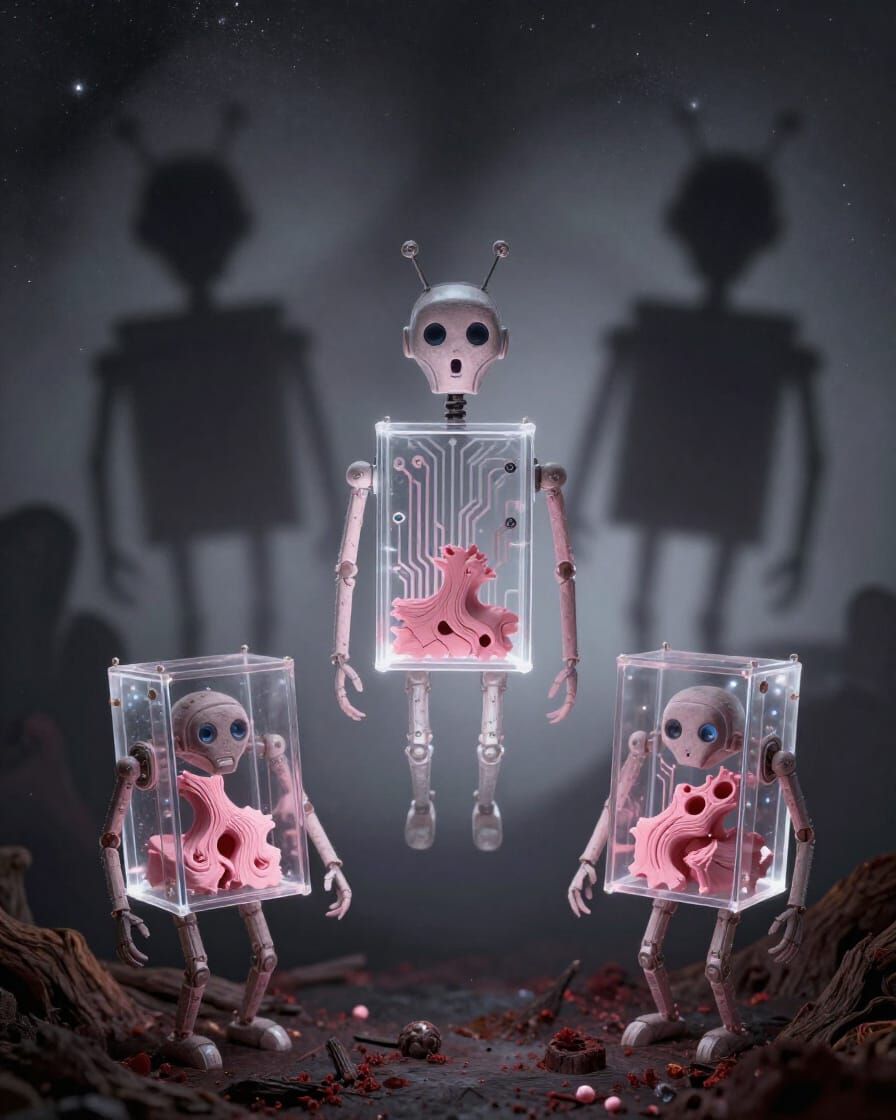 Pandora's bots extracted still screaming from bloodwood with pinkivorywood gumbot inclusions so simple they might be invisible manifestations of circuitbots floating inside transparent chassis. Shadows make bizarre shapes in a shrouded background woven from galaxies of uplights - the shadow bots are ...