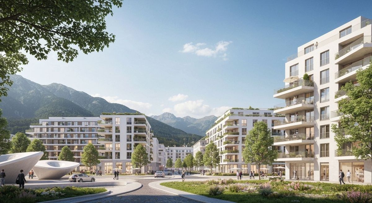This image depicts a modern, sustainable city in Innsbruck, Austria, with residential buildings, balconies, and public spaces set against the Tyrolean mountains. Rendered in a realistic style with parametric design elements.
