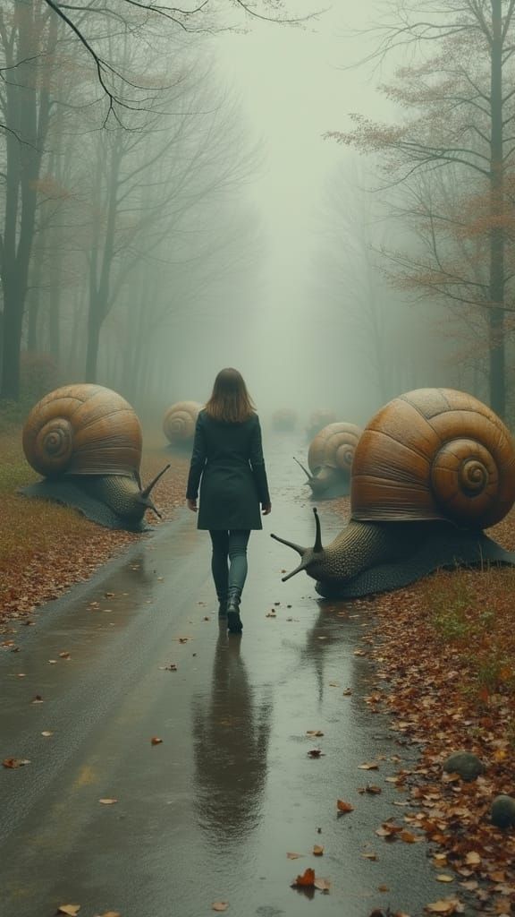 Airbrush, Dadaism, Pastel Colors. Art. Intellectual games from the point of view of surrealism by Erco Bruegel, decorations by Carrington. A woman walks along a wet road next to giant snails crawling along the road. Surrealism, foggy dense atmosphere, rich colors.