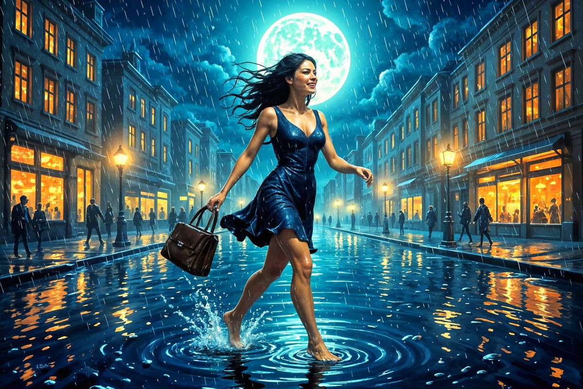 A vibrant impasto painting of a woman in a cocktail dress joyfully running barefoot through rain-soaked city streets at night, carrying her shoes and handbag.