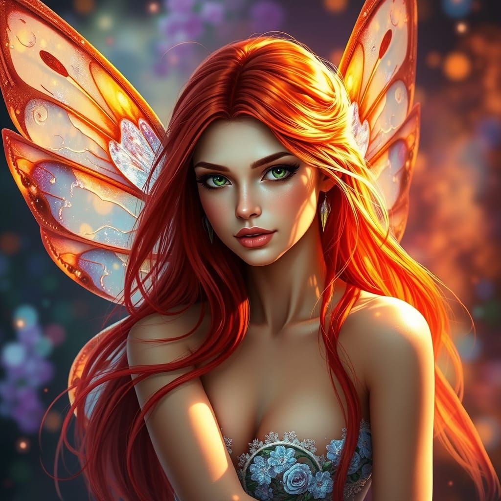 This hyperrealistic concept art depicts a butterfly fairy with flowing red hair and intricate wings. The image features vibrant colors, dramatic lighting, and ethereal highlights.