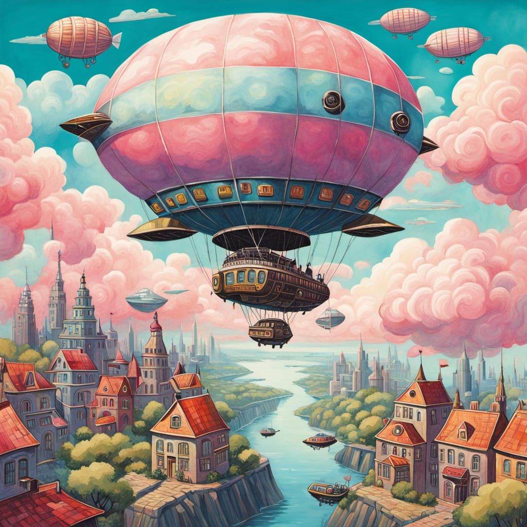 A vintage-style sci-fi illustration of an airship floating above a fantastical city. The artwork features bright pastel colors, soft lighting, and cotton candy-like clouds in a retro-futuristic aesthetic.
