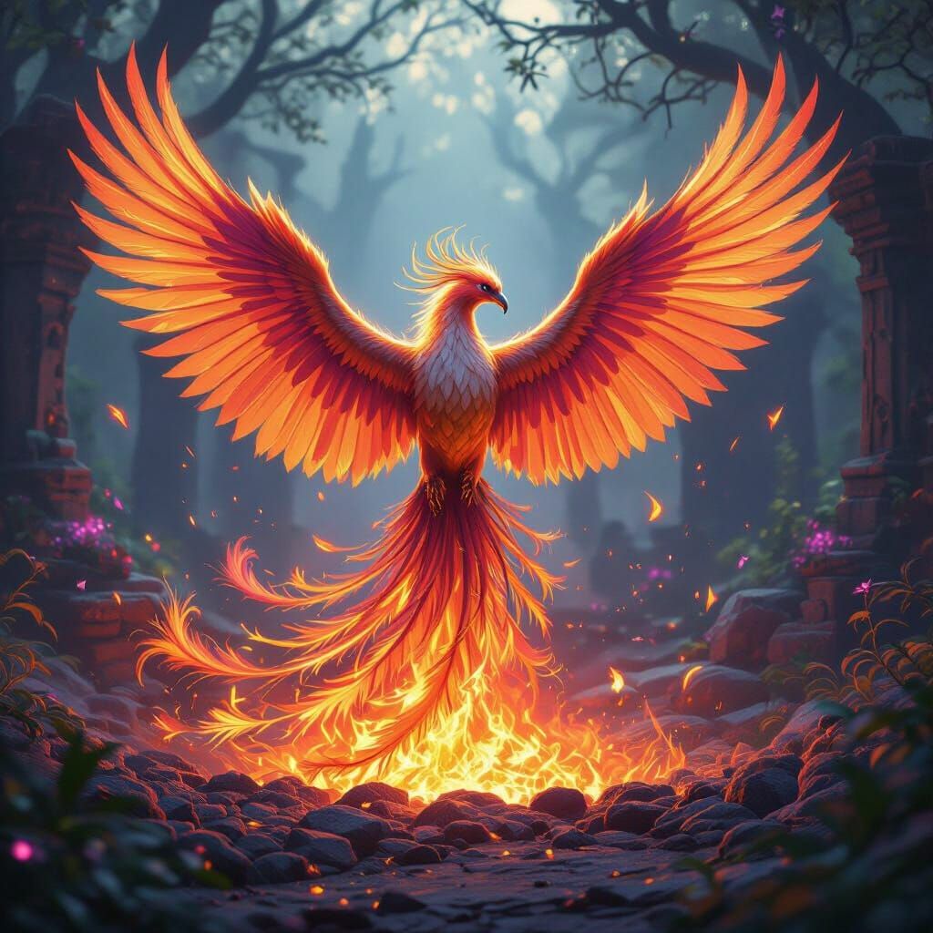 A majestic phoenix bursting from glowing embers within an ancient, mystical forest. The artwork features vibrant plumage, a high-fantasy concept art style, and dramatic cinematic lighting.
