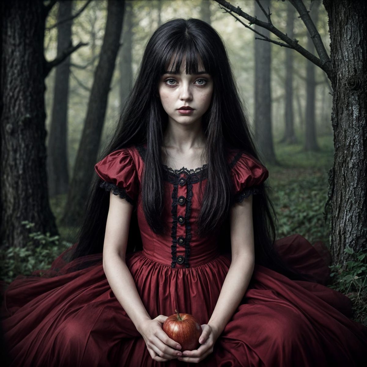 This photorealistic image shows Snow White with dark hair and a red dress holding a poisoned apple under trees. It features volumetric lighting and deep, contrasting colors.
