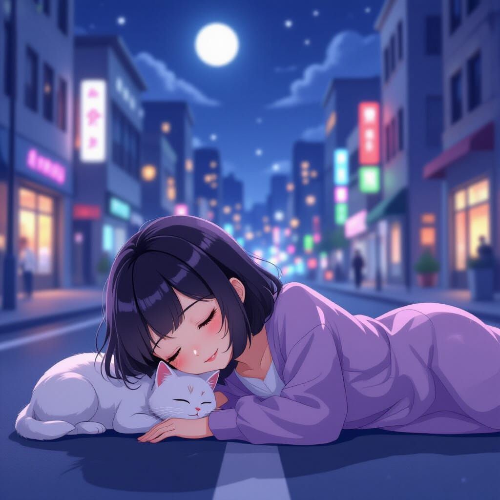 This 3D anime art features a mystical girl with dark bob hair sleeping beside her white cat on a moonlit city street. The image uses a minimalist, optimistic style with pistachio, apricot, and mint colors, showcasing ultrafine detail.