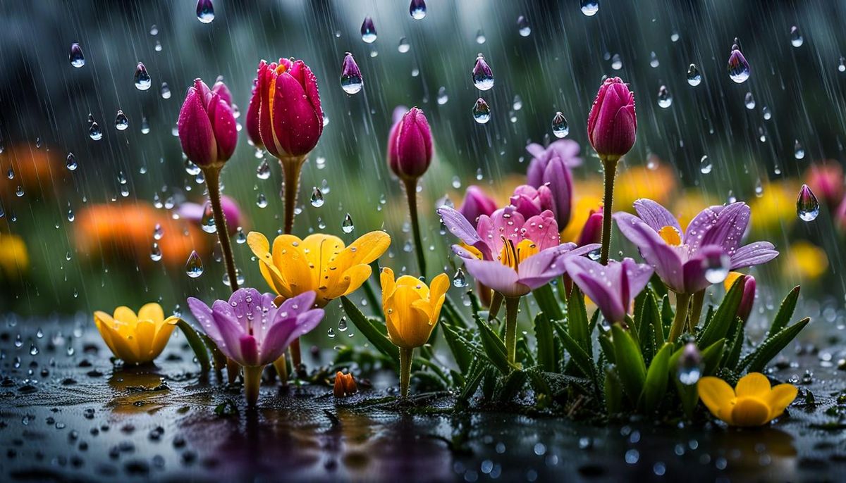 This image shows a vibrant spring day scene after rainfall. Flowers bloom, fauna explore the wet environment, and flora re-emerge with lush foliage, creating a serene atmosphere of renewal.