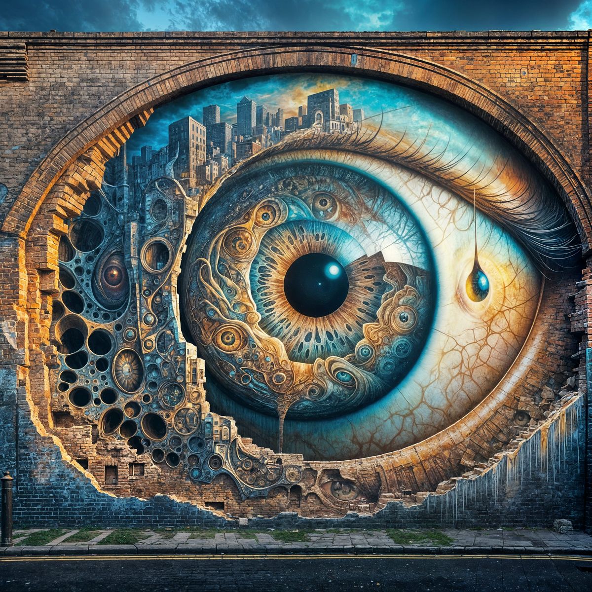This image shows a colossal eye mural painted on aged brick. The psychedelic street art uses trompe-l'oeil techniques to create a surreal, unnerving cityscape within the iris, illuminated by golden hour light.