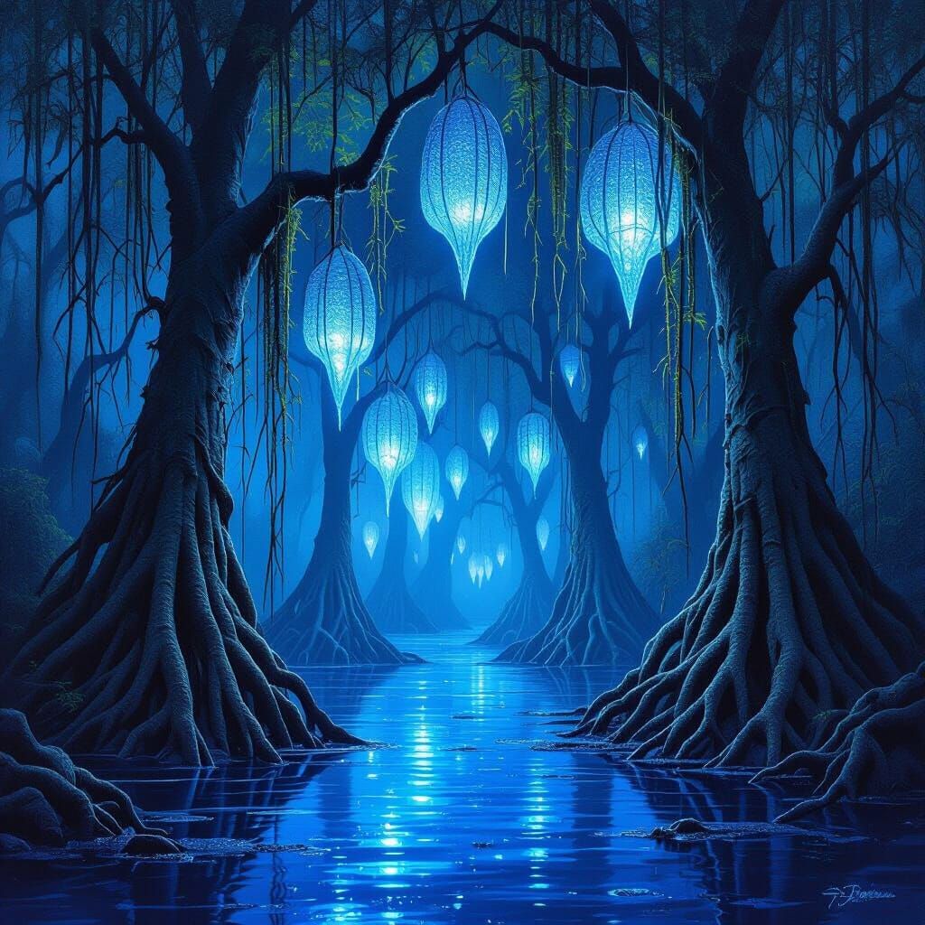 This image showcases towering, ancient mangroves at night, their seed-pods glowing with ethereal blue light. Gnarled roots twist in mystical, shadowy swamp waters, rendered in a surreal digital painting style.