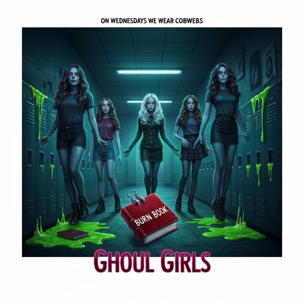 This image is a movie poster for 'Ghoul Girls,' featuring teen ghosts in a slime-dripping high school. It has a retro horror-comedy vibe with dark colors and neon accents.