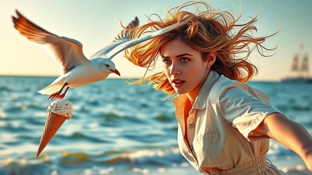 A woman pursues a seagull that has snatched an ice cream cone. This dynamic scene is rendered in a vibrant, hyper-saturated alcohol ink style with exceptional detail and golden hour lighting.