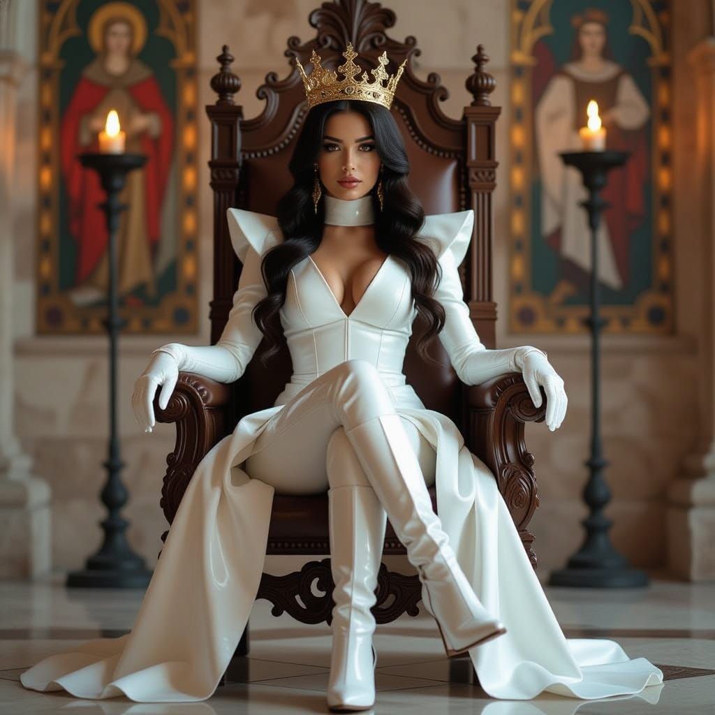 A striking picture of a dark-haired queen in a white latex catsuit and golden crown, seated on a throne before a stone wall. This Alphonse Mucha-inspired image blends realism and fantasy with ornate details.