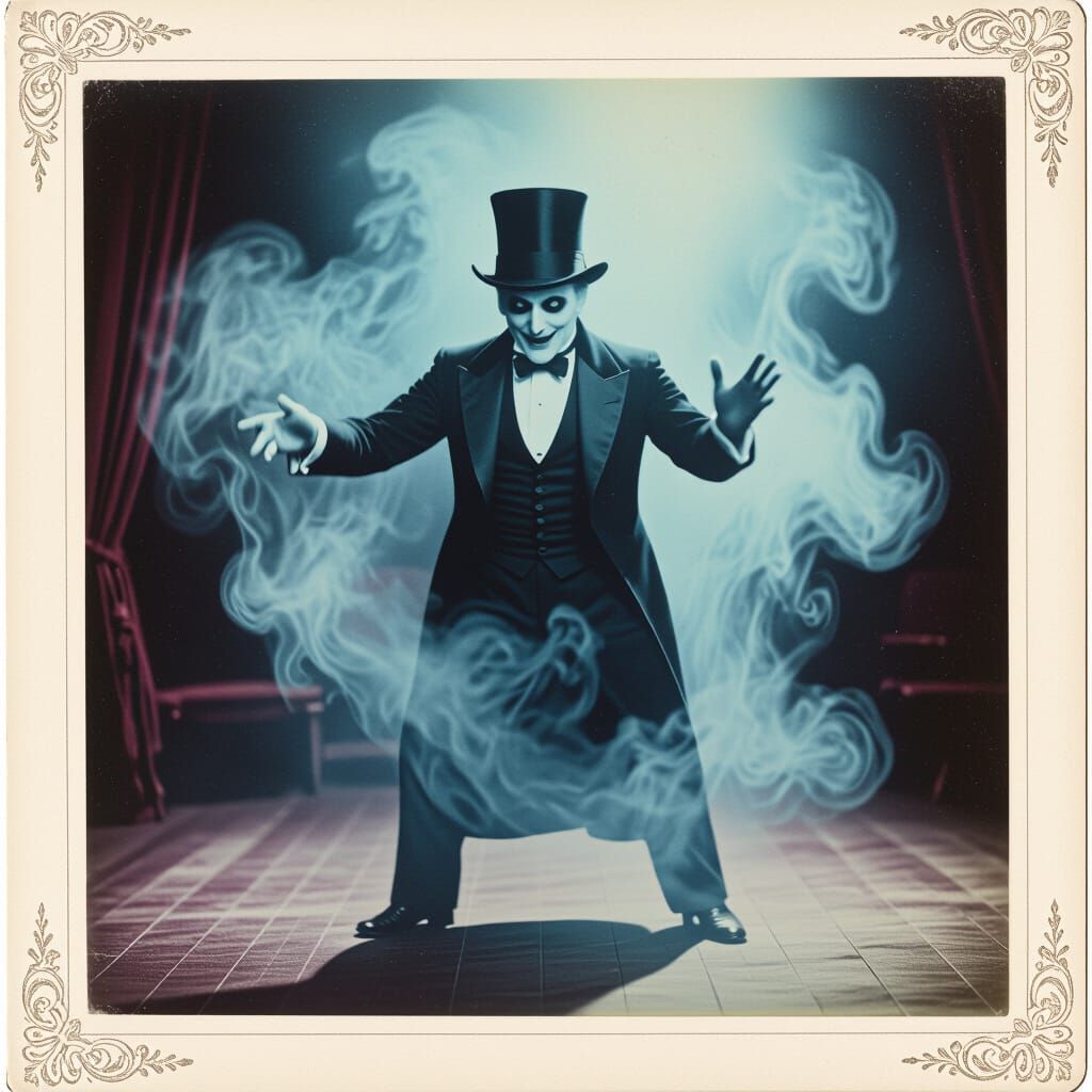 This image shows a vintage colorized photograph of a ghostly stage magician. The figure, in top hat and tails, performs a trick in a smoky theater with vintage eerie aesthetics.