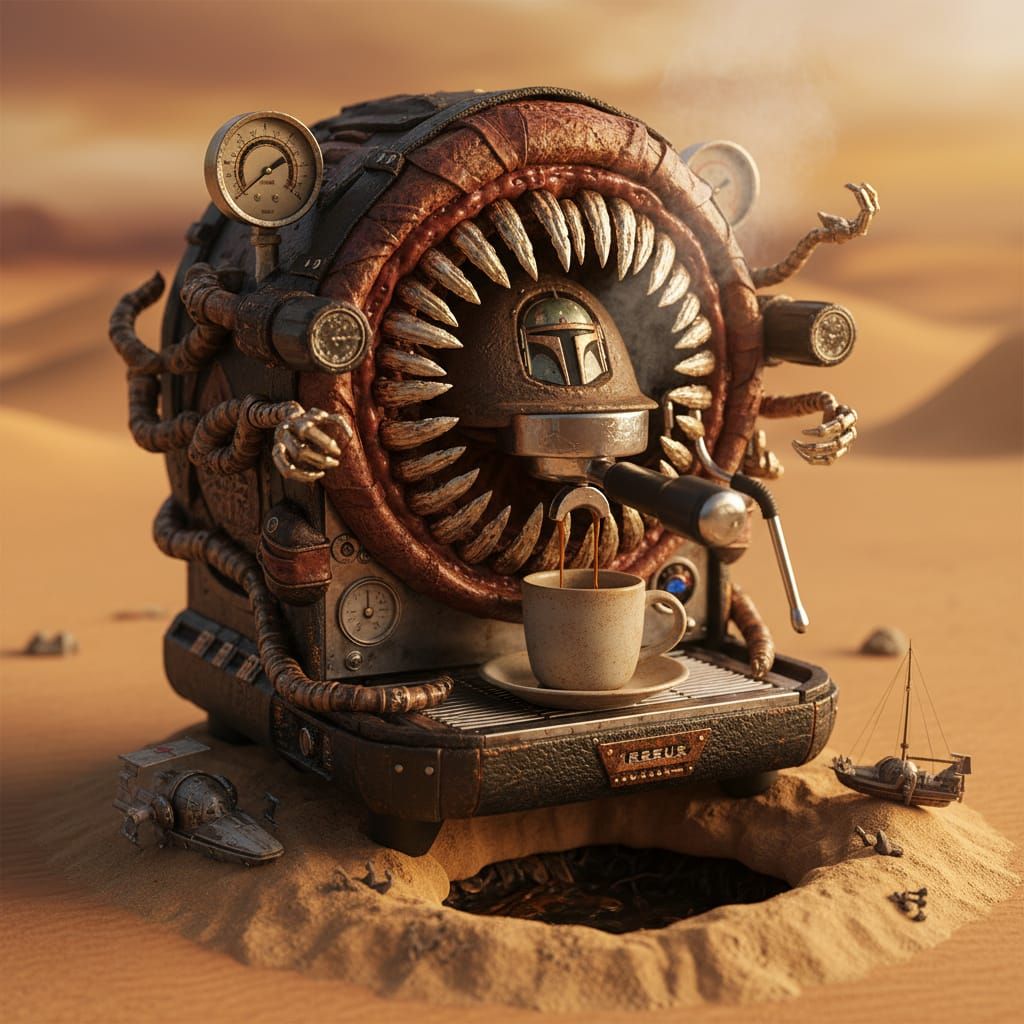 This image depicts an AI-generated Sarlacc espresso machine, a unique blend of science fiction and kitchen appliance design.