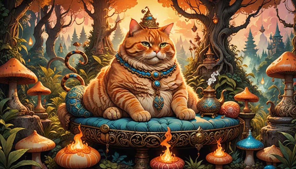This image shows a regal, fat cat lounging in a fantastical forest of glowing mushrooms, surrounded by opulent cushions and enjoying a magical hookah in a scene reminiscent of anime and high fantasy art.