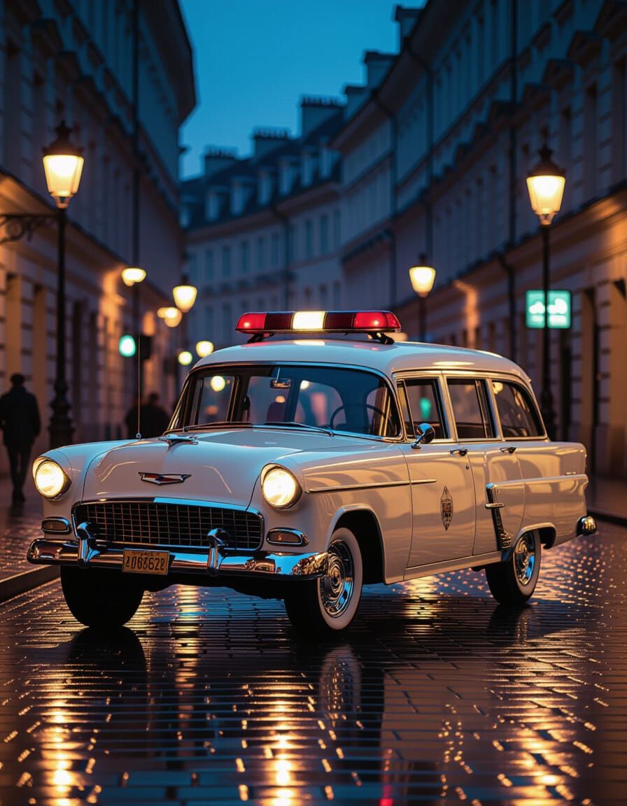 This highly detailed, photorealistic image shows a vintage 1950s ambulance parked on a wet cobblestone street in a European city at twilight. Soft, nostalgic streetlights create long shadows and reflections, evoking a sense of quiet melancholy.